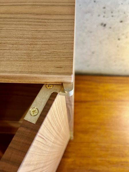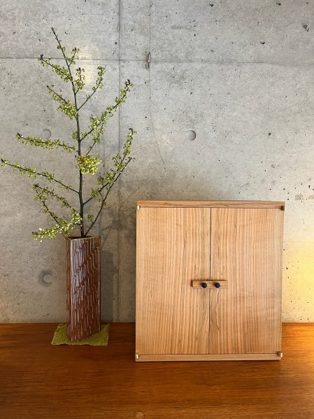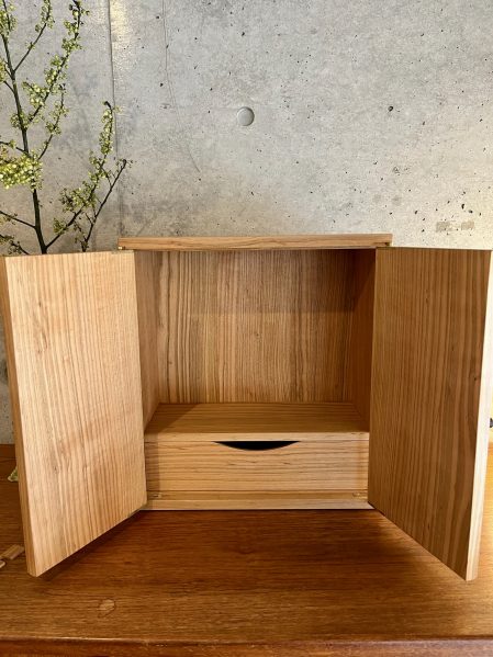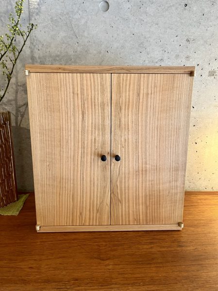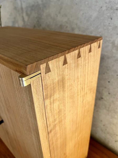 お客さまの特注で會田竜也さんにヤマザクラの小箱を作っていただきました。「小棚、厨子」などと呼べそうな大きさですがご発注者は「仏壇」として使用されます。「包み蟻継ぎ」(ハーフブラインドダブテイル)と呼ぶ高度な組み手や特殊な金物ヒンジ(Pヒンジ)が使われるあたりは會田さんの繊細な技が光るところ。ローズウッドの引き手もアクセントになっていて気品の漂う小箱でした。ご参考まで掲載しておきます。