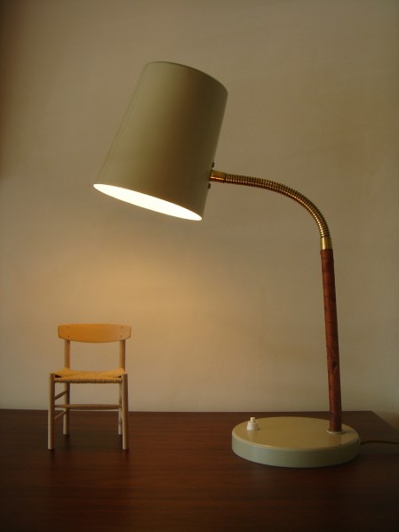 フィンランド1950年代のビンテージランプ。どっしりしたスチールの台座、革巻きの支柱、その時代独特のグレーベージュの厚い塗装。けっしてスマートとは言えない大きすぎるシェードはご愛嬌。